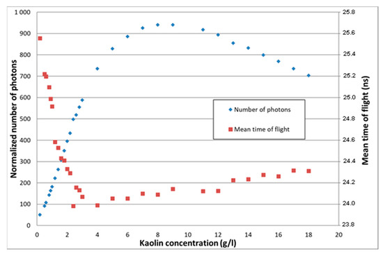 As suggested, concerning this additional TROT data treatment, Figure 10 shows for example the combined evolution of the normalized number of photons and their mean time of flight as a function of the kaolin concentration. For a given normalized number of photons associated to two kaolin concentrations, the different values of time of flight enable concentration disambiguation. However, an adapted data treatment algorithm still has to be elaborated.