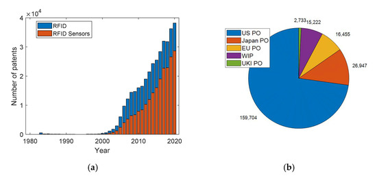 Number of (a) patents indexed on the Scopus database in February 2021 according to the keyword ‘RFID’ and the keyword ‘RFID Sensor’. (b) Number of patents issued by the main patent offices. Acronyms: United States Patent and Trademark Office (US PO), Japan Patent Office (Japan PO), European Patent Office (EU PO), World Intellectual Property Organization (WIP), United Kingdom Intellectual Property Office (UKI PO). Source: Scopus.