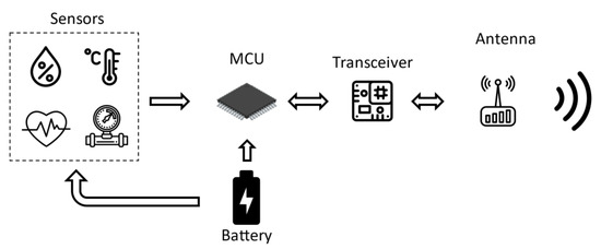 The typical hardware platform of a wireless sensor node consists of a sensor, a microcontroller, a radio frequency transceiver, and a power source. Each node is equipped with a physical sensor for revealing parameters of interest, such as light, temperature, sound, pressure, or other physical phenomena. The architecture of a wireless sensor node is shown in Figure 2. Power consumption, chip footprint, and computational power, as well as on-chip memory are very important features for a microcontroller. To this aim, choosing a low-power-consumption transceiver that connects the node to the network is crucial for saving power. In fact, current consumption of a transceiver takes up most of the power consumption budget. Transceivers are available from various manufacturers, such as Infineon Technologies AG (Neubiberg, Germany) [6], Analog Devices Inc. (Norwood, MA, USA) [7], and others. A crucial characteristic of a sensor node is the power source and battery management, especially in wireless sensor networks (WSNs), where the battery is irreplaceable. The node typically also includes a circuit that adjusts the RF front-end to compensate for changes of the RF front-end caused by the sensing element [8].