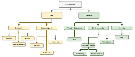 RFID sensors can be of different types, and are based on many different approaches. Some of the sensors are already available on the market, while other are still in development and are not yet mature enough for market applications. A classification of RFID sensors covering both chip-equipped tags and chipless tags is shown in Figure 3. The former set includes configurations in which the sensor is integrated directly into the tag (electronic sensors), whereas the latter rely on the modification of the tag response due to a detuning of the tag antenna for sensing (electromagnetic sensors). On the other hand, the chipless counterpart can exploit the properties of piezoelectric materials (acoustic sensors), the changes in the electromagnetic response of the tag (electromagnetic sensors), or thin-film transistors (electronic sensors) for sensing purposes.
