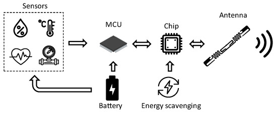 The battery assisted passive (BAP) class is comprised of RFID tags with an embedded battery. When the reader interrogates the BAP tag, the embedded battery is turned on, as well as the RFID tag IC and other sensors or actuators within the tag [14]. BAP RFID tags’ read range is clearly greater than passive ones, but is shorter than active tags. The operative life of these tags is limited by the battery, which is usually not replaceable. As an example, the Monza X-2K RFID chip manufactured by Impinj Inc. (Seattle, WA, USA) [15] provides a performance boost via a ‘battery-assisted passive mode’ [4], when both read sensitivity (−17 dBm) and write sensitivity (−12 dBm) of the chip increase up to −24 dBm when a DC voltage is provided [4]. Figure 5 illustrates a scheme of RFID tags relying on battery-assisted sensors. To limit the use of the battery, thus increasing the battery-life, energy harvesting solutions have been proposed and integrated into both active and battery-assisted RFID tags [16]. Technologies relying on thermoelectric effects, photovoltaic effects, or piezoelectric effects have been adopted for harvesting energy from the surrounding environment. Conversion of biomechanical energy into electricity has also been proposed in [17].