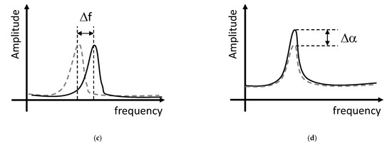 The two main mechanisms for detecting a variation in the sensor response are a frequency shift (Δf) of a resonant peak or a magnitude change (Δα) in the reflection coefficient, as depicted in Figure 6c,d. The frequency shift method is not compatible with RFID chip-enabled technology, since the resonant frequency shift of the antenna leads the information content far away from the operating frequency (868 MHz or 915 MHz). Therefore, magnitude change configuration is the most popular approach for RFID-based sensors.