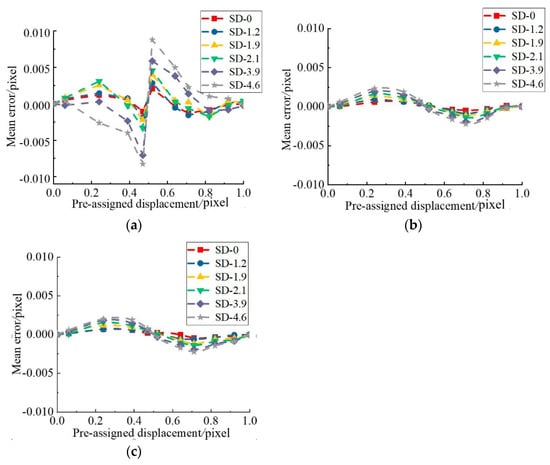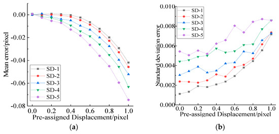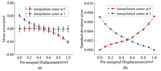 From Figure 4a, the mean error is very small when the true subpixel displacement is closer to the interpolation center, that is, Δx should be equal to Δx0 if the true subpixel displacement is 0 and the left pixel is used as interpolation center. Correspondingly, Δx should be equal to Δx1 when the true subpixel displacement is 1 and the right pixel is utilized as interpolation center. At the same time, the mean errors calculated from either interpolation center were almost equal when the true subpixel displacement is round 0.5 pixel, so the weight for Δx0 and Δx1 should be equal. Therefore, it is easy to draw the conclusion that aSD,0 = 0, aSD,1 = 1 and aSD,0.5 = 0.5.