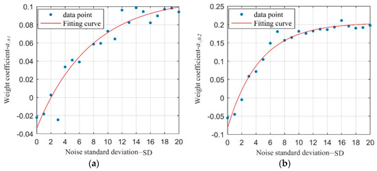 Fitting diagram of noise SD and weight coefficient a:,d: (a) a:,0.1; (b) a:,0.2.