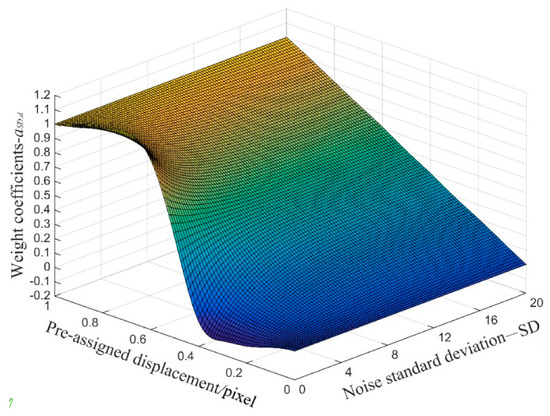 Figure 7 shows the curved surface of the weight coefficient aSD,d under different SD and the pre-assigned displacement at decile points between 0 and 1. Extracting parameter aSD,d from this surface, the subpixel displacement Δx could then be calculated using Equation (5).