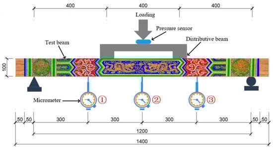 To further verify the proposed method, a simply supported beam with Chinese ancient painting on the flank was implemented, as shown in Figure 10 and Figure 11. The length, height, and width of the beam were 1400, 100, and 50 mm, respectively. The concentrated load was applied using a two-point distribution beam under a third-point bending of the tested beam. Three micrometers were used to measure deflection on quarter positions of the beam and the acquired data were taken as the reference displacement.