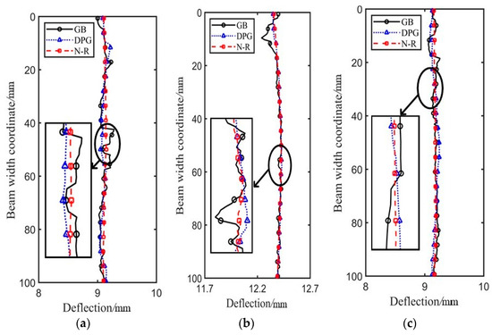Identification results along the height of the wooden beam under case 5 are depicted in Figure 12. It can be clearly seen that displacement identified by GB method differed greatly from those identified by the other two methods, and the result fluctuates up and down all the time, indicating that the accuracy of the GB method is not high and the stability is poor. The DPG method not only achieved high accuracy as that of the N–R method, but it also has good stability. At the mid-span monitoring position near the top of the beam, the identified deflection may produce a small error. This is because the image recognition will be affected by the background image when the boundary of pixel subsets contacts the edge of the wood beam or exceeds the edge of the wood beam, so recognition results may fluctuate. Therefore, when the displacement is monitored by the DIC method, some special algorithms should be utilized to address the boundary registration, which is beyond the scope of this study.