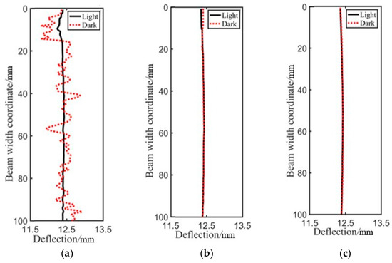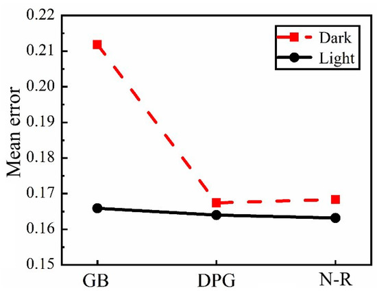 Since the trend was similar for all cases, only the results at micrometer 2 under case 5 are depicted in Figure 14, and Figure 15 shows the mean error of the recognition results under two groups of light and dark using different algorithm. Combining Figure 14 and Figure 15, it can be seen that in the “light” group with better lighting conditions, the mean error of the recognition results using GB, DPG, and N–R methods was almost the same. Meanwhile, in the “dark” group with poor lighting conditions, the deflection acquired by the DPG and N–R method fluctuated slightly along the identification area, but still maintained relatively high precision, while identification results by the GB method fluctuated significantly, indicating that the accuracy of the GB method is greatly dependent on the light condition.
