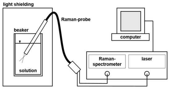 Raman Spectroscopy was performed with a tec5 MultiSpec®Raman system (tec5, Steinbach, Germany), equipped with a coaxial designed RamanProbe II (InPhotonics, Norwood, Massachusetts, USA;fibre configuration: 105 µm excitation fibre; 600 µm collection fibre/working distance 7.5 mm). Raman scattering was excited by a 500 mW temperature-stabilized semiconductor laser (Raman Boxx™, PD-LD500) source at 785 nm. The Raman spectra were collected with a 1 cm−1 solution ranging from 300–3215 cm−1 using MultiSpec Pro II Raman process software (v1.4.1189.1826, tec5, Steinbach, Germany). The probe was clamped with a laboratory stand in the 50 mL borosilicate beaker (from Schott, Mainz, Germany). Figure 1 shows the setup schematically. Each solution (1–10) was measured ten times with an integration time of 10 s.