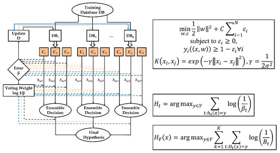 The rule of Equation (8) was used to reduce the weights of those data points that were correctly classified by the composite hypothesis . Furthermore, this lowered the probability of being selected in the following training subset.