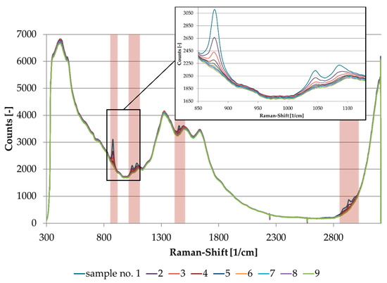 In Figure 4, the spectral data of the dilution series is displayed. For reasons of clarity, the range in between 850–1130 cm−1 was enlarged to show the linear concentration dependency more clearly.