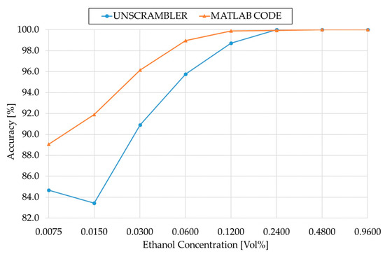 In Figure 5, the accuracy from The Unscrambler X and the accuracy from the MATLAB algorithm are plotted over concentration. For concentrations from sample number 1–3, the Unscrambler X models with the MATLAB parameters showed a significantly lower accuracy, while the MATLAB algorithm and the Unscrambler X model with the new parameters showed an accuracy of 100%. This implied that the Unscrambler X and MATLAB work with different parameters that cannot be taken from each other to create the same results. For calculated ethanol concentrations lower than 0.481 Vol% (sample number 3), the MATLAB algorithm generated higher accuracy and displayed slighter decrease in accuracy over the samples. At a calculated ethanol concentration of 0.0300625 Vol% (sample number 7), the MATLAB algorithm had the highest difference in accuracy compared to the Unscrambler model with approximately 8%.