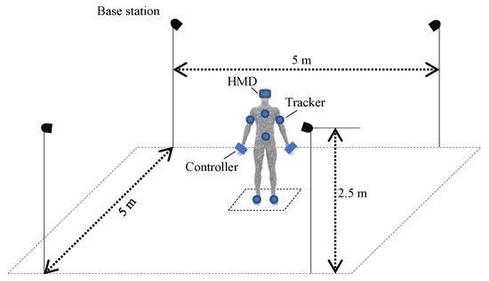The participants were equipped with an HMD (HTC Vive Pro), 6 Vive trackers (one at each foot, one at navel height, one at the sternum, one at each upper arm near the elbow) and one Vive controller at each hand. Four Vive Base stations were used to track the Vive devices (HMD, Controller, Tracker). The measurement setup for the HTC Vive system with the four base stations and a participant with an HMD, controllers and trackers is shown in Figure 2.