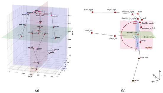 According to [25]. joint angles are generally referenced to body planes. The body planes are those that intersect the body frontal, sagittal and transversal planes [26]; see Figure 4a. When interpreting movements of the whole body, it is necessary that the respective body planes tilt or rotate based on the respective body postures. To achieve this based on kinematic data, specific joints were selected to attach the planes locally. This allowed the calculation of angles between a limb and a body plane. For example, for the elevation of the left shoulder, the frontal plane is orientated by the shoulder_center and chest position, and attached locally to the shoulder_left position. Then the elevation angle of the elbow_left position with reference to the frontal plane, lying within the sagittal plane can be calculated, as shown in Figure 4b. The direction of movement was determined using the cross product of plane and joint positions. For example, a straight-forward pointing arm would have a shoulder elevation angle of ; a straight-backward pointing arm would have a shoulder elevation angle of . See Table 2 for a list of the investigated joint angles with information about the chosen body planes and local orientations.