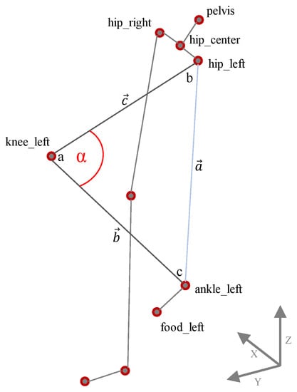 The flexion angles knee_(left, right)_flex and elbow_(left, right)_flex can directly be calculated from three Cartesian coordinates without using body planes. An illustration of the calculation scheme using knee flexion as an example can be seen in Figure 5. First the vector lengths between hip and ankle, knee and ankle and hip and knee—or and —need to be calculated using Equation (1). Subsequently, the angle in position a and thereby the flexion in the knee joint can be determined using Equation (2) [27,28].