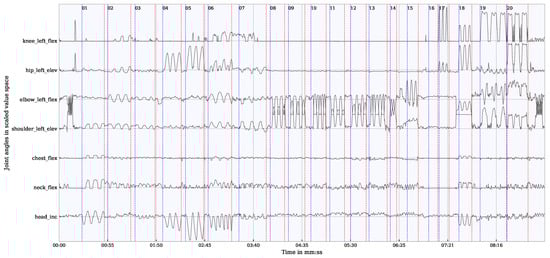 Time series of some exemplary selected joint angles. Time segments of the examined movements (01–20) are marked as vertical lines. Start of a movement in blue; end of the movement in red.