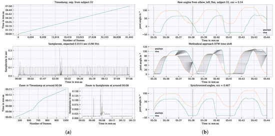 A closer look into the Vive time vector shows irregularities in the 90 Hz (0.011 s step width) sample rate. Examples of measurement interruptions are shown in Figure 7a. The resulting time shift between Qualisys and Vive at, e.g., the left elbow flexion angle, is shown in the top graph in Figure 7b. The segment boundaries refer to the time vector of the Qualisys with respect to the video recording. The task of the synchronization is to shift the Vive signal so that it is synchronized with Qualisys within the segments. To achieve this, two approaches were implemented which search for shifts in several iterations from rough to fine. Rough time shifts (0.5 s 2 s) can be identified by an approach based on the dynamic time warping (DTW). In general, DTW is used to identify commonalities between signals [33]. In the process, so-called pairs are formed, i.e., points between two signals that match each other. In order to measure a time offset from this, the pairs that lie on a horizontal plane in relation to each other can be used. Then an average value is calculated from the horizontal pairs, and this value is used for shifting. Due to the averaging in the method, the measured offset is a rough approximation, which is still not accurate enough. This approach is shown in the middle graph of Figure 7b.