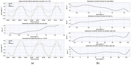 First, the time series of the respective joint angles were concatenated with the data from each subject using only the time segments in which the joint was moved. This step was performed for both systems. Subsequently, the differences (offsets) between the systems were determined. With the difference values and the corresponding angles of Vive, a polynomial regression function was then fitted. The determination of the degree of polynomial regression was studied iteratively, and the degree with the best accuracy (12th degree) was used. This function was then used to correct the joint angles for each individual subject. The systematic correction function and the corrected joint angle for the neck flexion angle are shown in the middle and lower diagrams of Figure 8a. The correction functions for neck_latflex, head_inc, shoulder_right_elev and elbow_right_flex are shown in Figure 8b to give examples of differently shaped correction functions.
