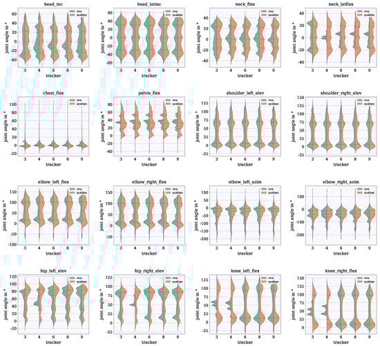 The sample-wise joint angle differences and their distribution are considered to assess the accuracy of the Vive combined with Final IK. The differences are shown in violin plots in Figure 9 and Figure 10. In Figure 9, the incidences of joint angles are shown with respect to the RoM. It can be seen whether certain angles in the RoM are frequently or rarely reached with both systems. Ideally, the shape of the Vive violin on the left is the same as the shape of the Qualisys violin on the right. This plot includes quartiles (25%, 50% and 75%) which provide indications of the frequencies of joint angles that occurred. In Figure 10, the incidences of joint angle differences are shown. This plot provides information about the value ranges in which the differences accumulated and which differences occurred more rarely. For a better elaboration of the range of values in which the differences varied and for the elimination of outliers, percentiles between 5% and 95% were calculated. The accuracy was described by the inter-percentile-range (IPR) of the 5th and 95th percentiles. The orientation of the median value indicates whether an angle is rather overestimated or underestimated. A median value at would mean that the difference is equally overestimated and underestimated or suggests that the signals match very closely.