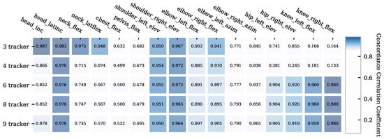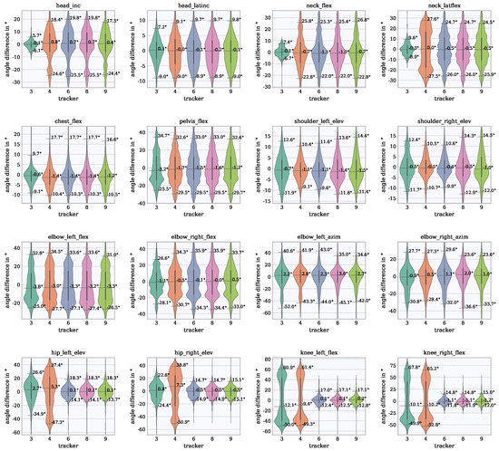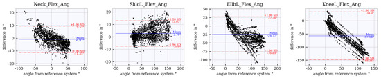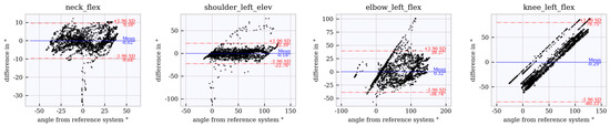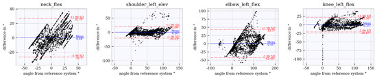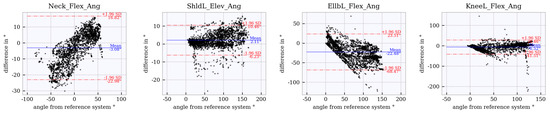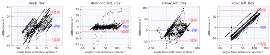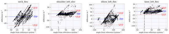 In the appendix, first modified Bland–Altman plots for each tracker configuration (3, 4, 6, 8 and 9) and further joint angles are presented in Figure A1, Figure A2, Figure A3, Figure A4 and Figure A5. Additionally, Bland–Altman plots for further joint angles of configuration 3 and 9 calculated by WIDAAN are presented in Figure A6 and Figure A7. Second, general data statistics are shown in Table A1.