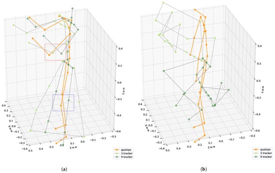 In order to be independent of a global coordinate system, the origin of the joint positions of both systems was initially set to the center of the hip. All other joint positions were then oriented to the hip’s center. This step was for visualization purposes only and allowed the kinematic data of both systems to be displayed in a unified coordinate system (see Figure 3b).