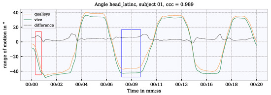 After the processing steps (1) to (6) as described before, the time series should be synchronized. However, time delays between the time series of Vive and Qualisys still occur for some participants. Therefore, a second synchronization process was performed, as otherwise a time shift would have a direct influence on the angle differences, although the angle itself could be accurate (but show up in another moment of time). This is due to short time interruptions in the time vector and in the time series data of the Vive system. These interruptions could be tolerable (if angular velocities are neglected) in using just one measurement system to determine tracking data, but for the comparison of the angles these shifts would influence the derived accuracy. Therefore, both signals should be synchronized as well as possible. For this reason, synchronization correction was calculated for each motion segment (i.e., for each specific movement), as explained in the following.