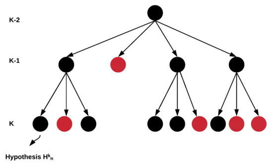 Tree representation of the formed multiple hypotheses. Black dot represents a hypothesis, and a red dot represents a hypothesis that pruned.