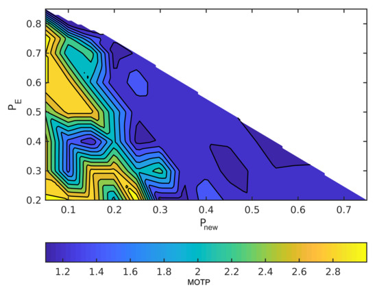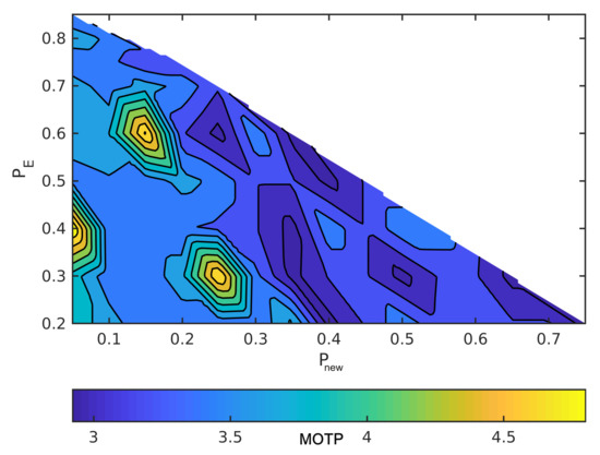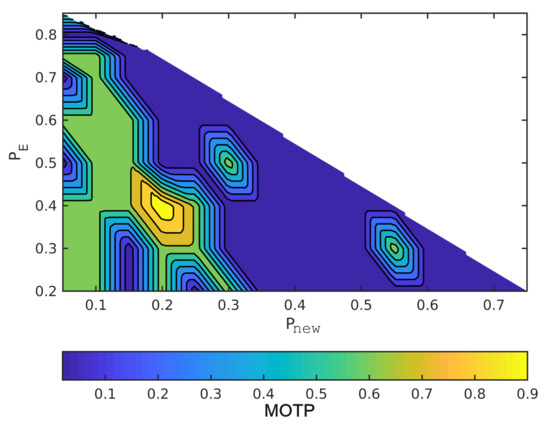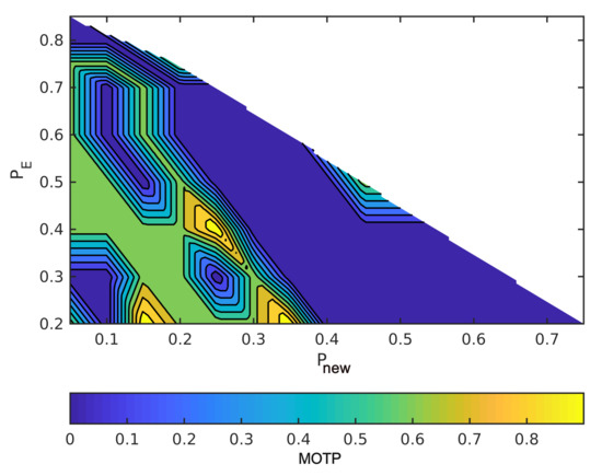 The horizontal axes are and the vertical axes are in order to read the figures. The summation of the probabilities is one, as we mentioned earlier. For example, when the point in the lower left has = 0.2, = 0, and, hence, = 0.8. Moreover, MOTP is the average overall VRUs/times. In all figures, dark blue means the minimum MOTP, and yellow indicates the maximum MOTP.