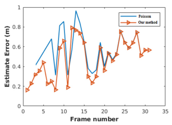 is a difference between the ground-truth data and the results of a state estimator, as shown in Equation (3). To have a fair comparison between the initialization procedures’ effects, we used the same tracker and test data. The test data were our 11 experiments, and we used [36] for tracking pedestrians. It should be noted that the same tracker means the same data association and the same state estimator. To initialize data association, the Poisson method should wait to collect data. Based on Figure 12, Poisson waits for three frames to collect data and build up confidence, which, here, the waiting time is 0.3 s. As a result ofthe 0.3 s delay in initializing the hypotheses-based data association, the hypothesis tree assumes a part of the measurements in the first 0.3 s is clutter. Therefore, the state estimator could not estimate the states close to the ground-truth data.