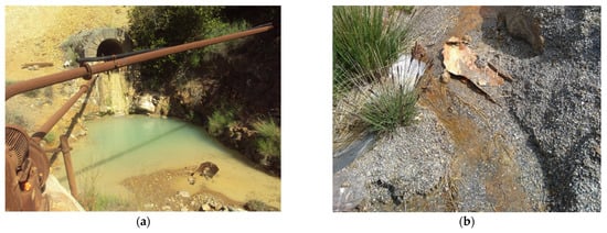 Surface water is the preferential dispersion route of these trace elements even at considerable distances from their source, and several reactions occur in the watershed with the consequent possibility of polluting drinking water supplies. Pollution sources are mainly grouped into two categories: point and diffuse sources. Point sources are mostly drainage adits (Figure 1a), which are groundwater that rises after the pumping used for the mining activity has stopped [11]. Diffuse sources are mainly due to leaching from deposits of waste materials (Figure 1b) either piled up in heaps, along river beds or buried [12]. These trace metal sources are not always easily identified as metals’ mobilisation depends on environmental conditions, such as stream flux, changes in pH and riverbed materials [13,14]. Mobilised metals can also be transported from headwater catchments to coastal areas [15].