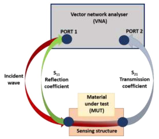 The principle of using microwave spectroscopy is based on the interaction of electromagnetic waves with the tested sample through a sensing structure. The measurement is based on the unique interaction between EM waves at microwave frequencies and a sample. The source is a vector network analyser (VNA), which provides a stimulus at low power (<1 mW) and monitors the response as S-parameters (Snn, scattering parameters), which use matched loads (50 Ω) to characterise EM behaviour. A VNA can be configured with one or two ports (Figure 3).