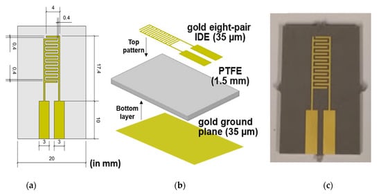 Gold-plated (Au) eight-pair IDE microwave sensors on PTFE substrates (Figure 5a–c) were selected as planar sensors for measuring the variation in metal concentration in polluted water, in both the laboratory and in situ. The layout and dimensions of the eight-pair IDE pattern sensor are shown in Figure 5a. Gold was used as the conductive metal material for both the bottom layer, which acted as a ground plane, and the top pattern to maintain chemical neutrality when the device is placed in contact with the analyte solution. The thickness of the Au layers was 35 μm. The microwave sensor was designed on a 1.5-mm-thick PTFE substrate. A distinct feature of IDE-type sensors is their higher sensitivity to change close to the sensor surface, which reduces the variation due to the external environment [83].