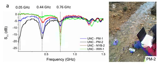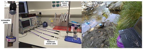 The low-cost miniVNA tiny was selected to perform in situ measurements, due to its simplicity and practicability. The miniVNA tiny is capable of sweeping between 1 MHz and 3 GHz with unit dimensions of approximately 80 × 80 × 35 mm. It has an SMA-style connection on one face for DUT and DET (equivalent to one-port and two-port configurations, respectively) and a USB connection on the rear. It operates via the USB connection, requiring 5 V, is connected to a laptop and uses VNA/J as data acquisition software. In addition, it was able to continuously save the data response every 5–10 s. Measurements of mining-impacted water were performed to assess (i) the prospect for quantifying metal concentrations in situ and (ii) the stability of the sensing response with the river flow.
