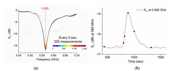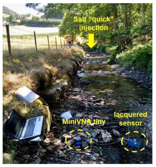 The feasibility to continuously detect the change in the microwave spectrum with NaCl and then return to its baseline spectrum was investigated (during fieldwork carried out by Onnis, Byrne, Hudson-Edwards, Stott and Hunt [99]) using the miniVNA tiny and a lacquered sensor, connected via USB to a laptop, and extracting data every second (Figure 7).