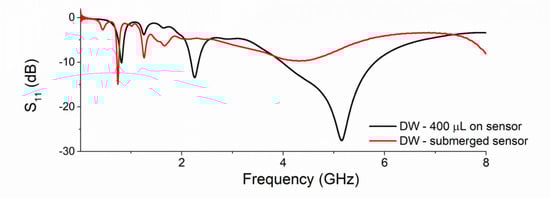 The response of the sensor manifests itself as a resonant frequency change or an attenuation of the signal [58]. Different materials have diverse permittivities, and a mixture has a permittivity value which depends on the permittivity of each component and its structure [59]. The correlation of the permittivity of a material with its composition can indicate the properties of the material, with a consequent identification of the changes in the material’s parameter.