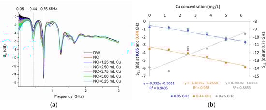 Puangngernmak and Chalermwisutkul [94] are the only researchers who also experimented the detection of trace metals (Cu, Zn and Ni) in water with concentrations of 1, 10, 100 and 1000 mg/L using an open-ended coaxial structure and a VNA. They demonstrated the detection of these metals at frequencies lower than 2 GHz and the differentiation of these metals between 2 and 3 GHz. Notwithstanding, they showed the differentiation of only high concentrations (100 mg/L) of these metals, resulting in the system not being adequate for the detection of these metals in mining-impacted waters.