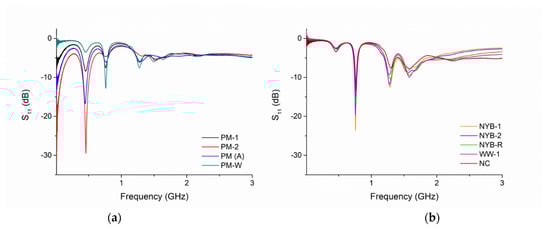 A one-port configuration (S11 measurement) measures the reflection coefficient (return loss or Γ) of an MUT, which depends on how much the incident wave propagates through or is reflected by the sample. A two-port configuration (S21 measurement) allows the measurement of the transmission coefficient, which depends on how much EM power propagates from one port (port 1) through the MUT and is received at the second port (port 2). This configuration allows the determination of both transmitted and reflected signals. S-parameters vary with frequency. The output has an amplitude and a phase, so it is a vector quantity. Amplitude (reflection coefficient magnitude, |S11|) is shown as a spectral response in dB (y-axis) versus frequencies (x-axis) and represents the amount of energy that is absorbed at that specific frequency. Changes in the spectral output can also be related to changes in impedance parameters, such as resistance (R) and capacitance (C). As the frequency increases, voltage and current become harder to define because the wavelength becomes small compared to the circuit dimensions. The reflection coefficient magnitude (|S11|, described as S11 in this work) then becomes a more useful representation. A reflection coefficient of 0 dB represents a mismatch (100% reflection); an S11 of-∞ dB is a perfect match (0% reflection/100% transmission).