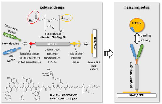 The following are available online at https://www.mdpi.com/article/10.3390/s21093153/s1, Figure S1: 1H-NMR spectrum of allyl p-toluenesulfonate in CDCl3; Figure S2: Superimposed IR spectra of educt allyl functionalized polymer and product carboxylic acid functionalized polymer; Figure S3: Titration curve of COOH-PMeOx20-SEt; Figure S4: Titration curve of COOH-PMeOx20-SEt; Figure S5: Superimposed IR spectra of educt polymer COSPh-PMeOx20-SEt (grey), product polymer peptide conjugate CGGWYKYW-PMeOx20-SEt (black) and peptide CGGWYKYW (green); Figure S6: Stacked 1H-NMR spectra of educt CGGWYKYW-PMeOx20-SEt (grey, top) in deuterated DMSO, educt acetylated allyl mannose (blue, middle) in CDCl3 and the product AcMan-CGGWYKYW-PMeOx20-SEt conjugate (red, bottom) in deuterated DMSO; Figure S7: 1H-NMR spectrum of Man-CGGWYKYW-PMeOx20-SEt after dialysis in deuterated DMSO; Figure S8: Section of the Man-CGGWYKYW-PMeOx20-SEt product spectrum (blue) where sugar signals are visible; Figure S9: 1H-NMR spectrum of Man-CGGGF-PMeOx20-SEt after dialysis in MeOD; Figure S10: Exemplary spectra of the saturation of the gold surface with BSA in SAW affinity studies; Table S1: pH titration of carboxylic acid functionalized polymers against 0.01 M sodium hydroxide solution.