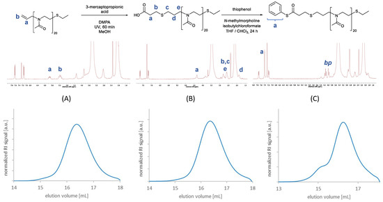 The resulting polymer was then functionalized with a carboxylic acid group via thiol-ene chemistry (step B), using 3-mercaptopropionic acid as a reaction partner and DMPA as photoinitiator. In 1H-NMR spectroscopy (see Figure 2 mid), disappearance of the characteristic allyl signals from the educt polymer at 5.84–5.75 and 5.22 ppm and the formation of new signals from the formed alkyl chain as well as alkyl signals from the attached mercaptopropionic acid at 2.94–2.90, 2.78–2.69 and 2.65–2.57 ppm confirm a successful conjugation reaction with a complete conversion of the educt.