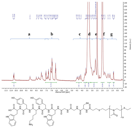 Figure 3 shows a representative 1H-NMR spectrum of CGGWYKYW-PMeOx20-SEt. The spectrum displays both characteristic signals from the peptide as well as the polymer. Clearly recognizable are some individual signals such as the tryptophan indole NH at 10.72 ppm, the aromatic ring signals of tyrosine and tryptophan at 7.56–6.56 ppm from the peptide part of the conjugate, or the methyl side chain group at 1.99–1.97 ppm from the polymer part of the conjugate. With so many protons contributing to the final spectrum and superimposing each other, it is not feasible to assign the rest of the signals individually. Instead of assigning and integrating single proton signals, the spectrum was subdivided into different regions (a–g). The total integral values that were determined for each region matched the expected number of protons of each part of the conjugate.