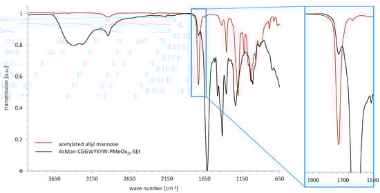 Superimposed IR spectra of acetylated allyl mannose (red) and product conjugate AcMan-CGGWYKYW-PMeOx20-SEt (black) with weak, but characteristic, C=O stretching vibration at 1736 cm−1 (highlighted with blue box).