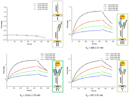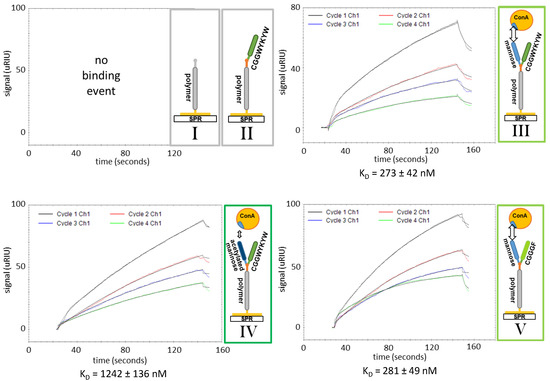 In contrast, mannose derivatives are expected to have a high affinity to ConA [43,44]. Conjugates between polymer and mannose therefore showed strong binding to ConA. This was examined in experiment III (see Figure 5, top right), where a conjugate between polymer, peptide CGGWYKYW, and mannose sugar was attached to the gold surface. An affinity to the lectin with a KD of 388 ± 57 nM could be measured. The experiment was repeated several times with different batches of polymer conjugate, and each time yielded identical results with similar KD values.