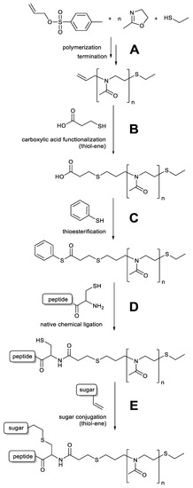 The synthesis strategy leading to such a conjugate is depicted in Scheme 1 as a step-by-step reaction cascade. It consists of five steps (A–E), including polymerization and termination leading to the basis allyl-PMeOx20-Set polymer (A), attachment of a carboxylic acid functionality (B), conversion into a thioester group (C), NCL for the conjugation of peptides (D), and a thiol-ene-mediated sugar conjugation (E).