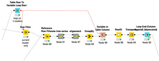 Further, to obtain the time series for each cluster, the hourly, daily, weekly, or monthly time series from the previous section were filtered and fed into “time series” followed by the “alignment” Meta node, as shown in Figure 3. The loop node was implemented to extract the values for each meter with respect to its assigned cluster as shown in Figure 4.