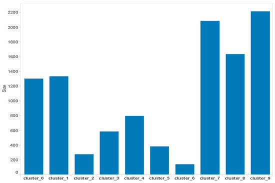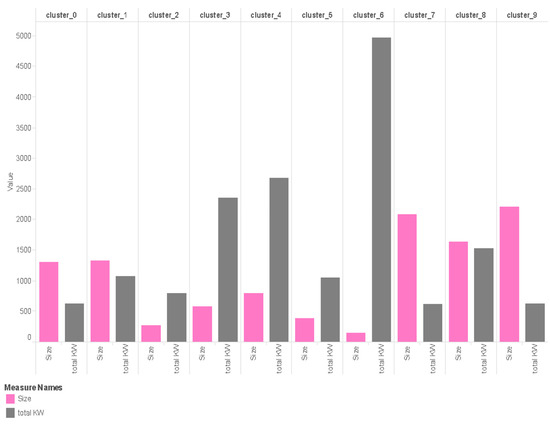 Total power consumption of different clusters over three months during the summer (December–February), corresponding to their size, can be seen in Figure 5. The following are some of the assumptions we can make from these clusters. Firstly, clusters 3, 4, and 6 are very small, and their consumption rates are very high, especially cluster 6. Therefore, this makes us wonder about the possible reason for such high consumption. There are a few parameters that we have found which could be the reason. These clusters could be big families with more rooms in the house that have more people in the families. A second reason could be that in these families, most of the time, people stay at home and use appliances. Therefore, the work profile of these people could be that of retired or older people, and they must be having some business. As we have seen in the data for summer, we can possibly assume that they use air conditioners in all rooms. Their economic condition is very well such that they afford such high consumption.