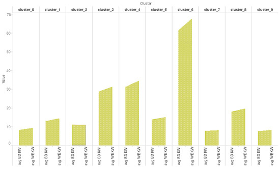 The electricity consumption of ten different clusters over three months (December–February) of summer, in terms of the consumption on weekdays vs. weekends, where BD stands for Business day and WE as weekend, are as shown in Figure 8. One thing clarified here is that if we look at the consumption depending on the day, all clusters except clusters 2 and 7 show a rise in consumption on weekends. This is because everyone is at home on weekends, which means that more appliances are used, hence, more consumption. Overall, there is more consumption on weekends, which means more load on the utility companies. Therefore, this can help them to calculate how much extra load is expected on weekends in order to take appropriate actions. Clusters 3, 4 and 6, that have more consumption on weekends, could be segmented separately and offered special tariff plans. From this consumption, we can also assume that clusters 2 and 7 are families working on weekends as well.