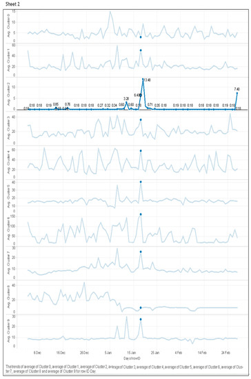 The line chart represents the electric consumption by ten clusters over three months (December–February) of summer in a daily fashion as shown in Figure 9. Cluster 2 suddenly shows the peak value. As we already had performed the data preprocessing, there was a minimal chance for data noise. It is interesting to see that this peak was not only the case with cluster 2, but the rest of the clusters were also showing the same pattern, which makes us more curious. On our investigation, we found that this trend was due to the high temperature of 46.5 degrees Celsius that was marked as the hottest day by the Bureau of Meteorology [25].
