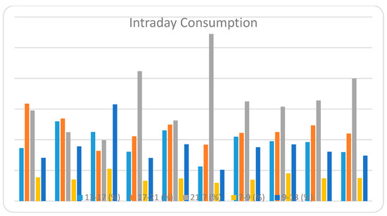 Table 3 represents the electricity consumption by ten clusters in five different hourly intervals of a day over three months (December–February) of summer. Consumption is defined as a percentage of their total consumption. For intraday consumption, we divided 24 h in 5 intervals according to the consumption pattern, which are as follows: