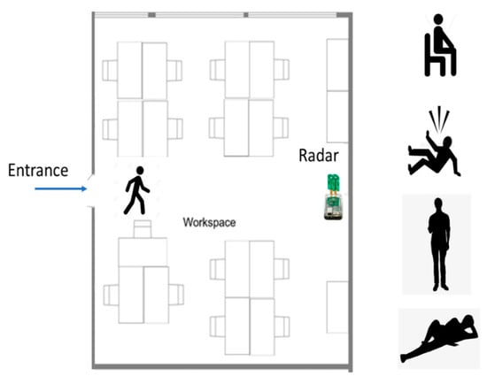 Experiments were carried out in an office room at the University of Florence. The room dimensions were 4 m × 5 m × 3 m. The UWB radar was put on a wall at a height of 1 m, on the opposite side of the entrance (see Figure 2). The room had typical office furniture (desks, chairs, scaffolds, etc.), which correlate with the furnishing of a sanitary environment. One chair was put in the middle of the line between the entrance and the radar. Experiments had the objective of providing enough data to develop an algorithm for the classification of selected movement actions: walking, standing up, sitting down, lying down, and falling. In addition, the entrance and exit of a person to and from a room was also provided by the same data, thus indicating when a person was present in a room.