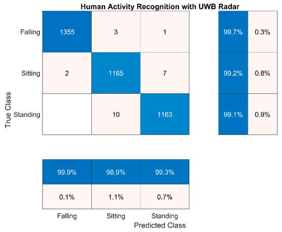 ML algorithm used for classification typically “learns” a pattern into part of the data set. Then, the rest of the data set is used to test the accuracy of the classification. In our case, we used 50% of the data set to train the ML algorithm, and the remaining part to test the accuracy of the classification. As it can be seen from Figure 3, the KNN ML algorithm was able to correctly identify the posture with an accuracy greater than 99%. This accuracy value is similar (sometimes even better) to those mentioned in the literature, e.g., [,]. In [], a Doppler UWB radar and an ML technique were used to discriminate movements from fixed position, and accuracy spanned from 91.7% to 100%. In [], the UWB radar, together with a convolutional neural network (CNN), was used to discriminate walking and standing, with an accuracy of 99.7%. It is important to point out that here we not only discriminated movements from static positions but we also identified the types of posture: standing, sitting, and falling/laying down.